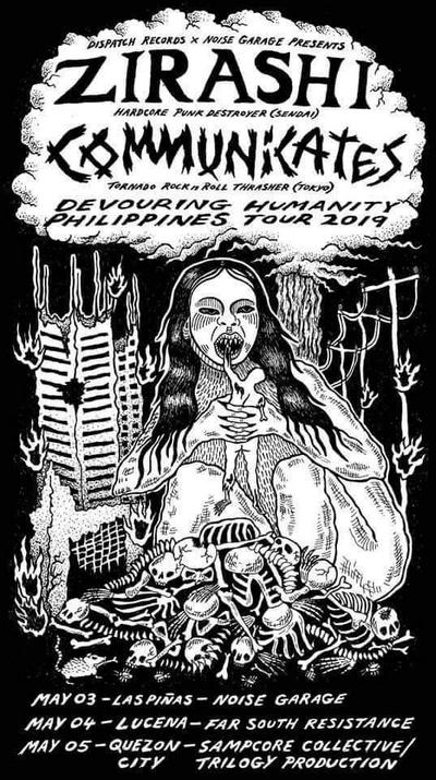 | 2019/5/3(Fri) | @PHILIPPINE LAS PINAS@noise grage ZIRASHI×COMMUNiCATES 「DEVOURING HUMANITY PHILIPPINES TOUR 2019」 Op/TBA St/TBA Ticket:TBA ■COMMUNiCATES ■ZIRASHI and more... ![]() |